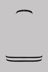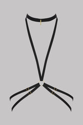 The VELVET SET black harness traces the lines of the bust with precision. Made from soft-touch velvet, it features adjustable straps that gently embrace the silhouette. A golden Maison Close-engraved charm adorns the piece. Designed to be worn on its own or attached to the matching open panty, it creates the illusion of a bodysuit. A versatile lingerie accessory, delivered in its black velvet pouch.