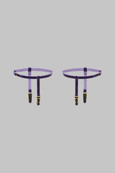The VELVET SET purple garters enhance the legs with refined elegance. Crafted from soft-touch velvet, they are fully adjustable to suit all body types. Featuring golden suspenders, they can be gracefully paired with stockings. Wear them alone or styled with the matching panty and harness from the collection. An accessory that bridges the body and the detail.