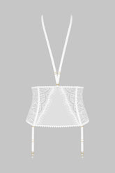Waist-cincher suspender belt combining eyelash lace with see-through tulle edged with picot elastic. Graphic cut that accentuates the waist. Suspenders and choker harness are removable and can be adjusted with gold-tone accessories. Flexible vertical whalebones for improved structure and support. Adjustable hook-and-eye fastening on the back. Can be worn as a suspender belt or a waist-cincher.