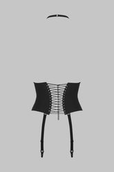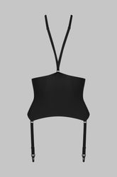 This thong bodysuit with detachable and adjustable garter belts offers a bold and elegant look. The V-shaped lacing at the neckline provides a precise fit and a graphic touch, while the black metallic finishes enhance its sophisticated style.
