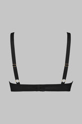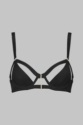 Opaque microfibre bondage bra. Bust harnessed with elasticated straps and a panel of heat bonded microfibre. Opens with gold hooks between the breasts.